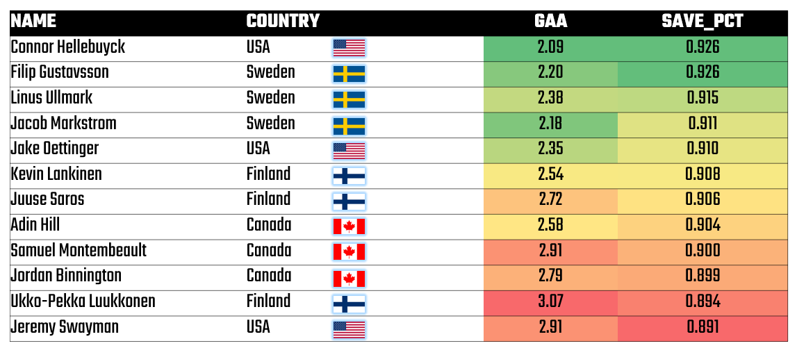 Canada was the strongest competitor from the above, but this week we saw Canada slip slightly in physicality and continue to remain lower in the goaltending ranking. For Team USA, you can clearly see that Connor Hellebuyck remains at the top of the ranking, with Jake Oettinger and Jeremy Swayman dispersed across the other goaltenders.