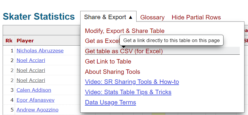The data for this walkthrough was sourced from Hockey-Reference, which is a great site with a ton of stats. To get the data: