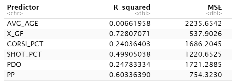 The results should be something similar to the below. Note that for variables that are better predictors the R-Squared value should be higher and the MSE should be lower (and reverse where the variables are less predictive). Here again, you can see that X_GF, PP and SHOT_PCT are higher than the others, but the numbers when running the model are lower than just running a straight correlation analysis.