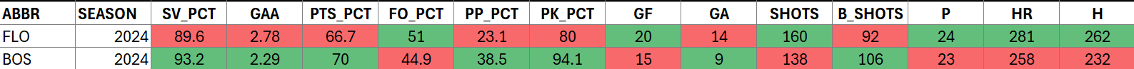 In dramatic fashion, the Bruins managed to eliminate the Maple Leafs last night. They'll now face the Florida Panthers in Round 2, so we created a similar table with the same five metrics we used for the Rangers and Hurricanes.
