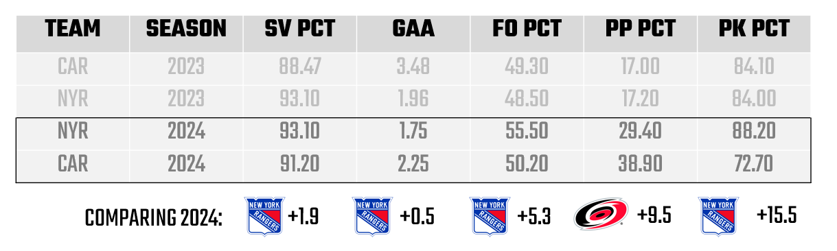 Using this visualization, you can see the difference for each team between last season and this season. For example, in 2023, most statistics for New York and Carolina were close, save for goaltending – Carolina had a worse Save Percentage and GAA. For this season's playoffs, though, New York is out in front for all metrics save for Power Play Percentage.