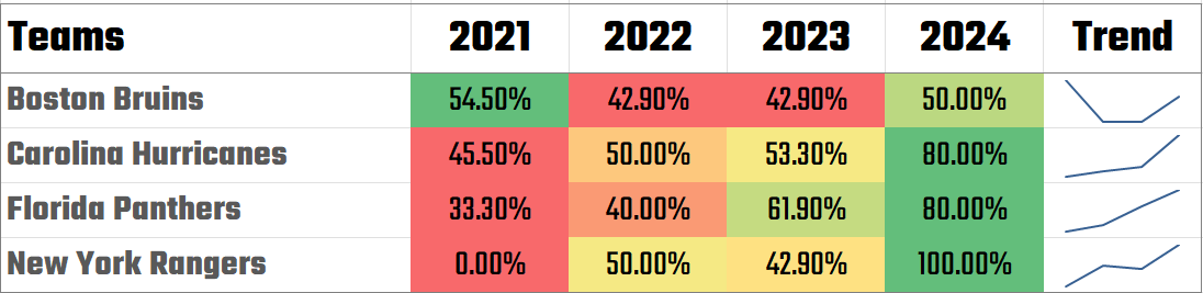 We then took a subset of the metrics and analyzed two upcoming series, Carolina versus New York and Boston versus Florida. We sourced the data for the analyses from Hockey-Reference and from our own data provider (My Sports Feeds), and then used Excel to create different views we shared here.
